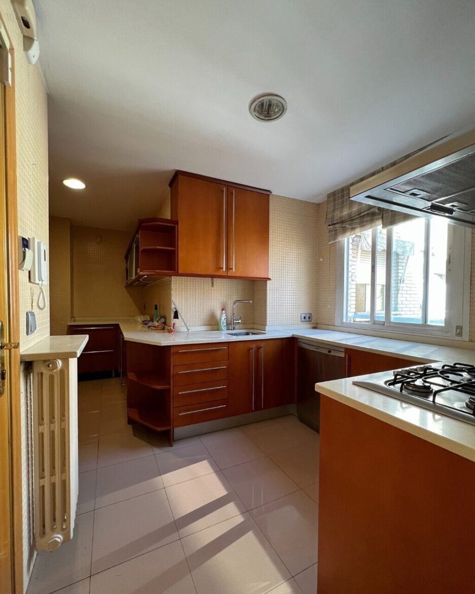 La cocina original presentaba todos los clichés de su época: azulejos en color crudo hasta el techo, una encimera de porcelánico poco estética, muebles superiores e inferiores en tonos de madera oscuros que apagaban la luz natural, y una distribución en forma de L que generaba rincones inútiles.